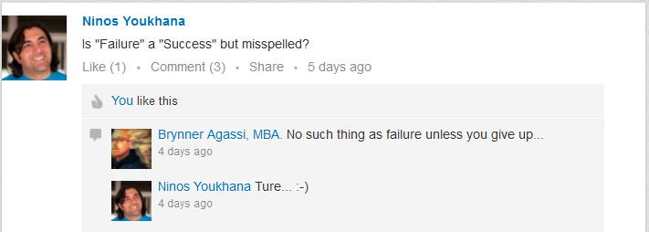 One of my connections on LinkedIn answered my post with: “No such thing as failure unless you give up.”